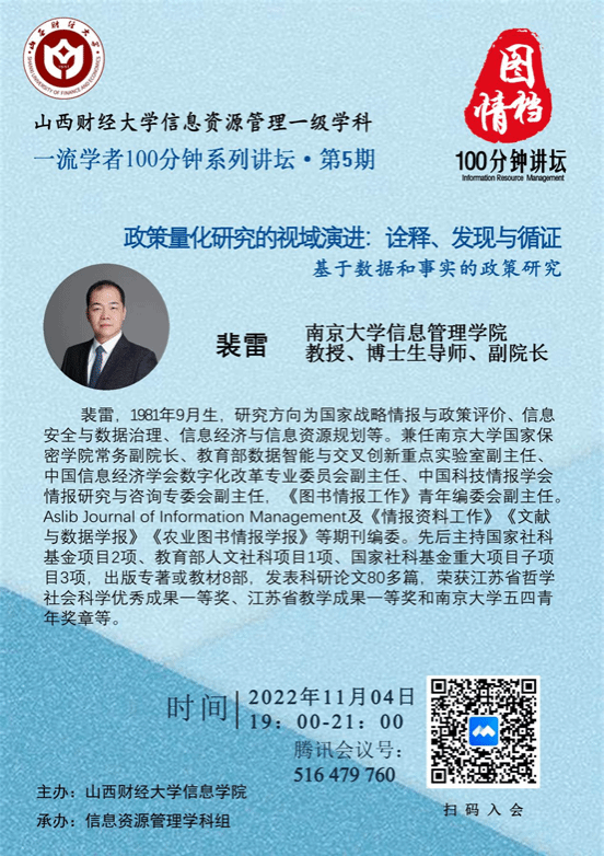 主讲人:裴雷,1981年9月生,南京大学信息管理学院教授、博士生导师,副院长,研究方向为国家战略情报与政策评价、信息安全与数据治理、信息经济与信息资源规划等。兼任南京大学国家保密学院常务副院长、教育部数据智能与交叉创新重点实验室副主任、中国信息经济学会数字化改革专业委员会副主任、中国科技情报学会情报研究与咨询专委会副主任,《图书情报工作》青年编委会副主任。Aslib Journal of Information Management及《情报资料工作》《文献与数据学报》《农业图书情报学报》等期刊编委。先后主持国家社科基金项目2项、教育部人文社科项目1项、国家社科基金重大项目子项目3项,出版专著或教材8部,发表科研论文80多篇,荣获江苏省哲学社会科学优秀成果一等奖、江苏省教学成果一等奖和南京大学五四青年奖章等。