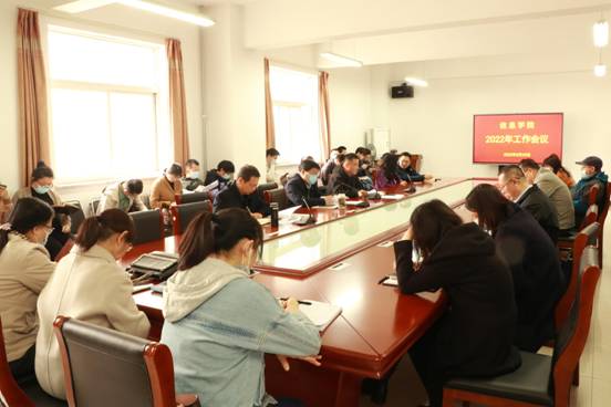 在学院会议室召开2022年工作会议,对本年度学院重点工作进行安排部署,学院党政领导班子、全体教工参加,学院党委书记周红斌主持会议并做动员部署。