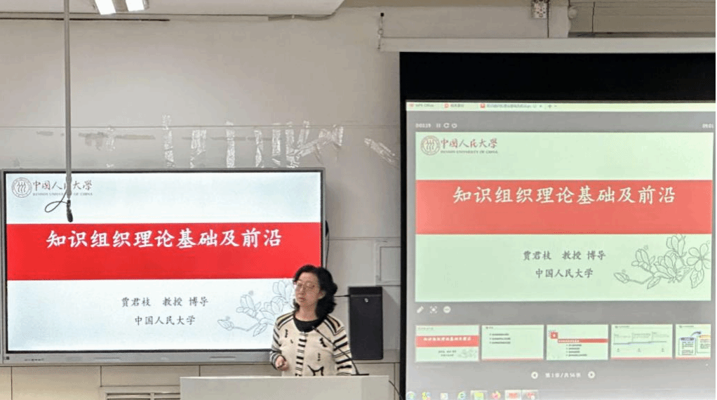 讲座第一部分为知识组的理论基础。贾君枝教授从20世纪30年代英国编目专家布里斯首次提出知识组织的概念切入,系统回顾了知识组织的理论基础,以及文献组织阶段、网络资源组织阶段、知识组织阶段等发展历程。随后,贾君枝教授向师生分享了知识组织的本质、核心构成要素以及知识组织系统的概念、内涵、类型等。第二部分为知识组织的语义化发展,包括对语义网、RDF(资源描述框架)、知识图谱相关内容的分享。第三部分为讲座重点,即知识组织的智能化发展,主要介绍了深度学习算法在知识组织系统构建中的应用、主题标引设计算法以及人工智能模型在知识组织中的应用等问题。