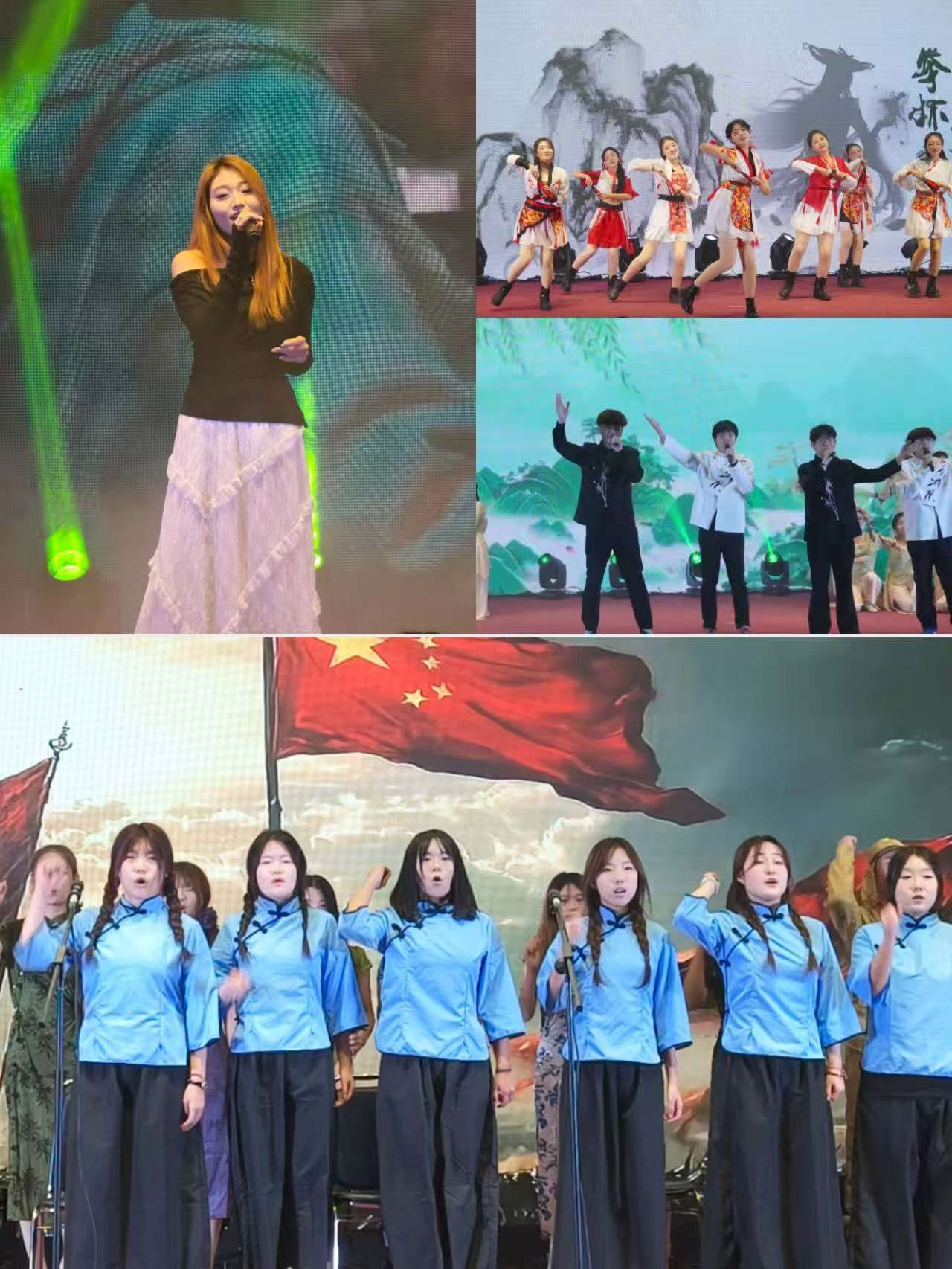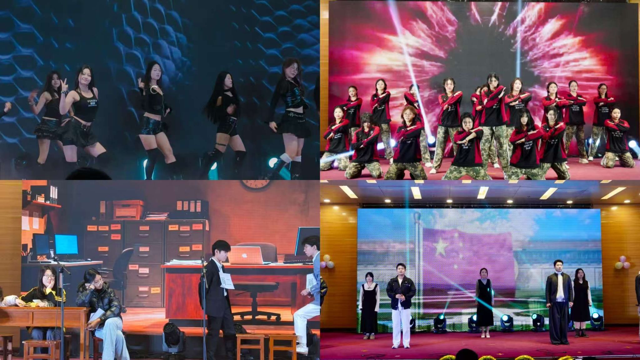 联欢会由歌舞《上春山》开场。舞者们身着翠绿衣衫搭配素白罗裙,手持团扇轻摇,以灵动跳跃的舞步与舒展流畅的肢体,勾勒出春山初醒、万物复苏之景。古风女团舞《千盏》,将古典韵味与青春气息完美融合,展现了传统文化在新时代的创新表达。男女合唱《Forever Love》,声音清亮高亢,旋律悠扬婉转,深情对唱将舞台点燃。话剧《金陵十三钗》以历史为幕,舞台光影穿透时空,展现中华儿女在民族危亡之际,以舍生赴死诠释民族大义。男团舞《Lucifer》、舞蹈串烧《dance party》,彰显新时代青年昂扬向上、勇往直前的精神风貌。